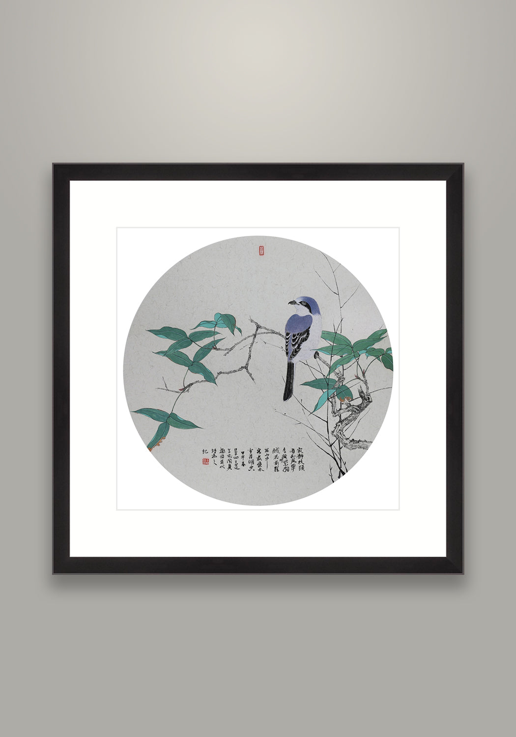 作品簡述:寂靜枝頭有和風 ,翠色掩映紫羽絨。花前難留山中客,最愛林間月明空。