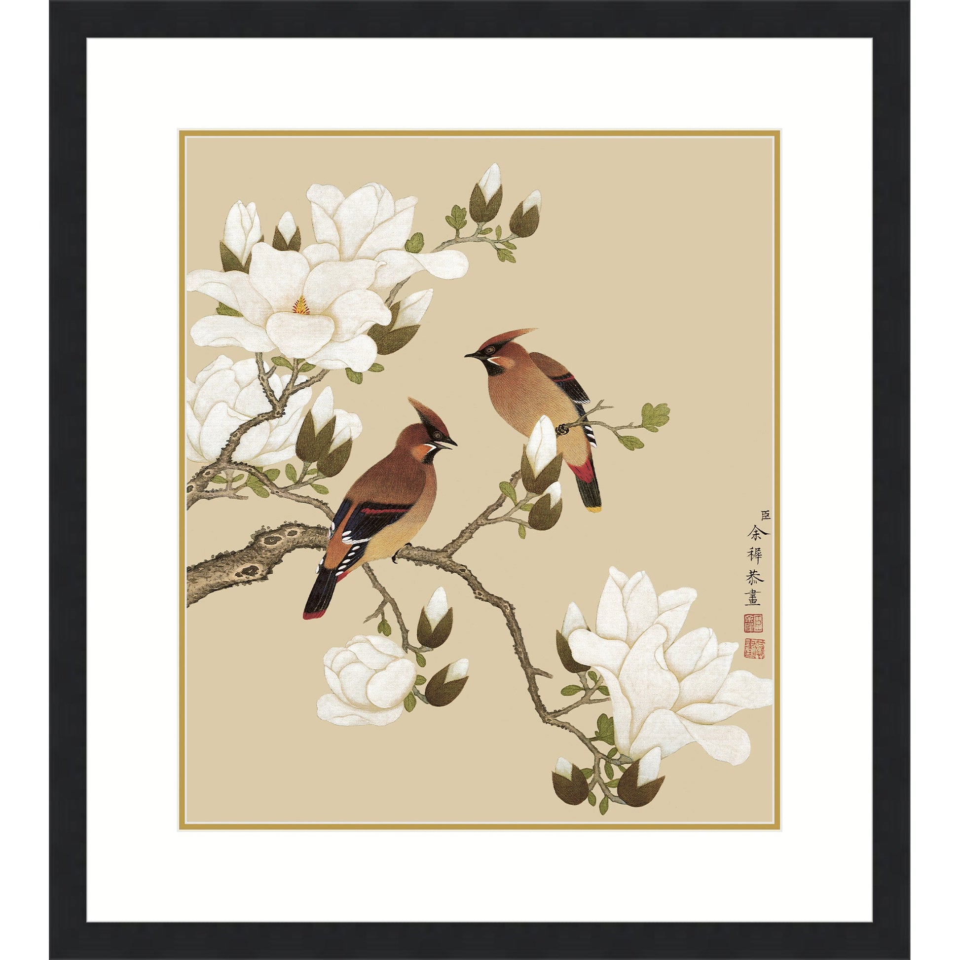 關於作品:玉蘭花開,潔白如玉的花瓣與兩隻棲息其間、酒紅色的紅梅鳥相映成趣。尚未綻放的花苞,更暗示著美麗仍在悄然醞釀。筆法細膩,設色高雅,賞心悅目,讓人彷彿置身其境。